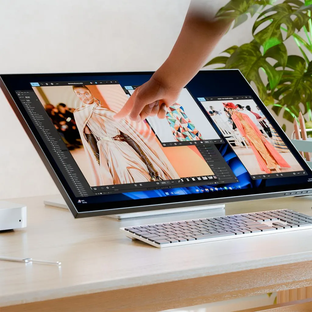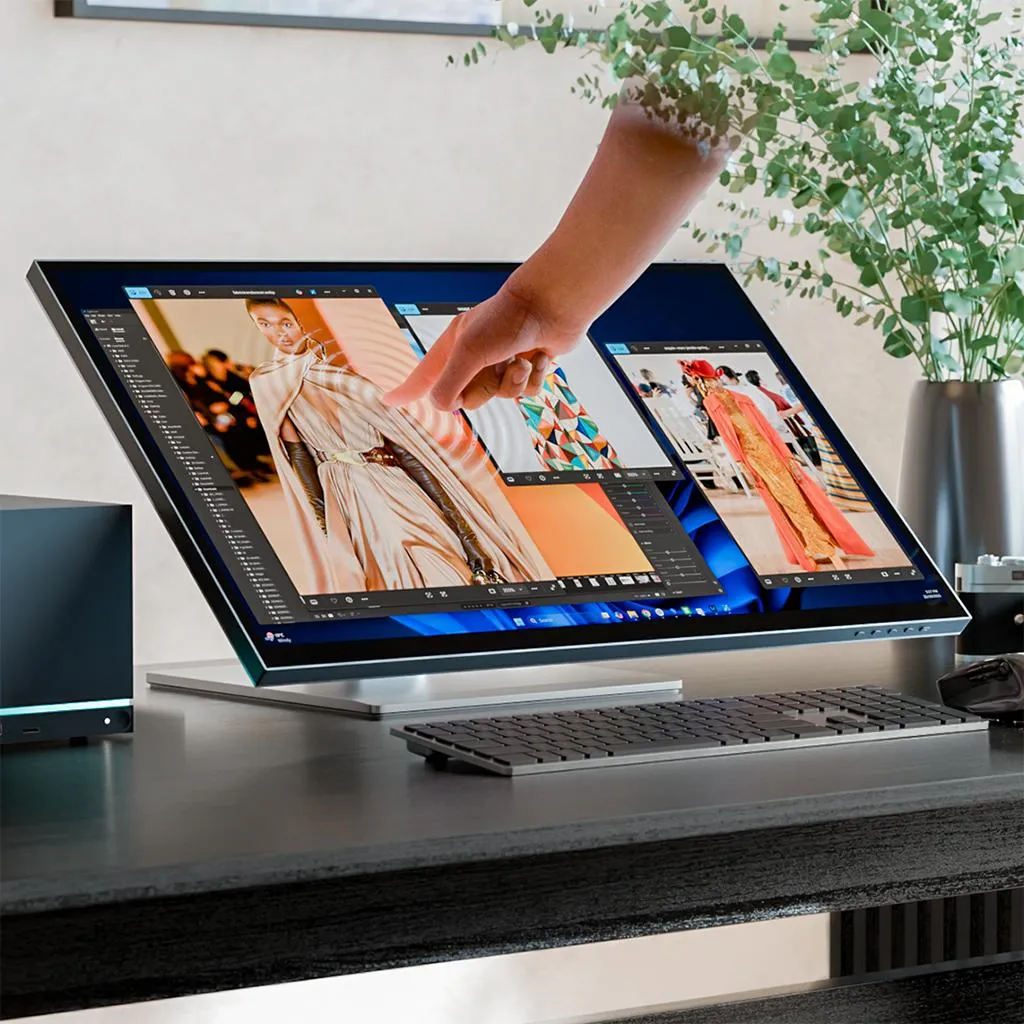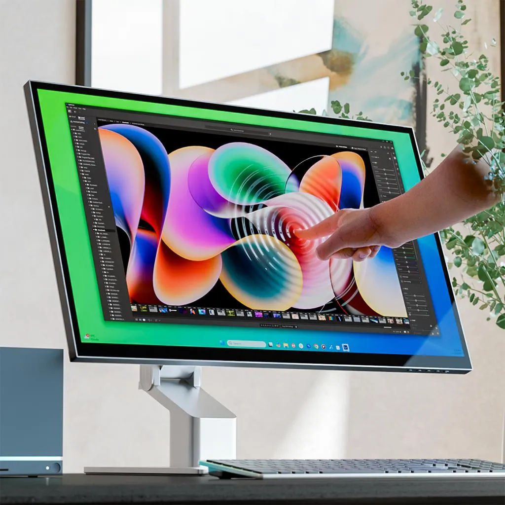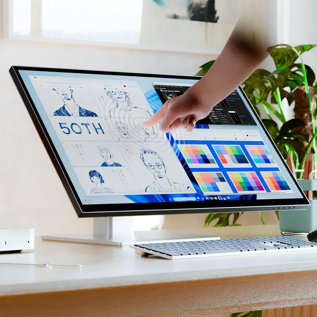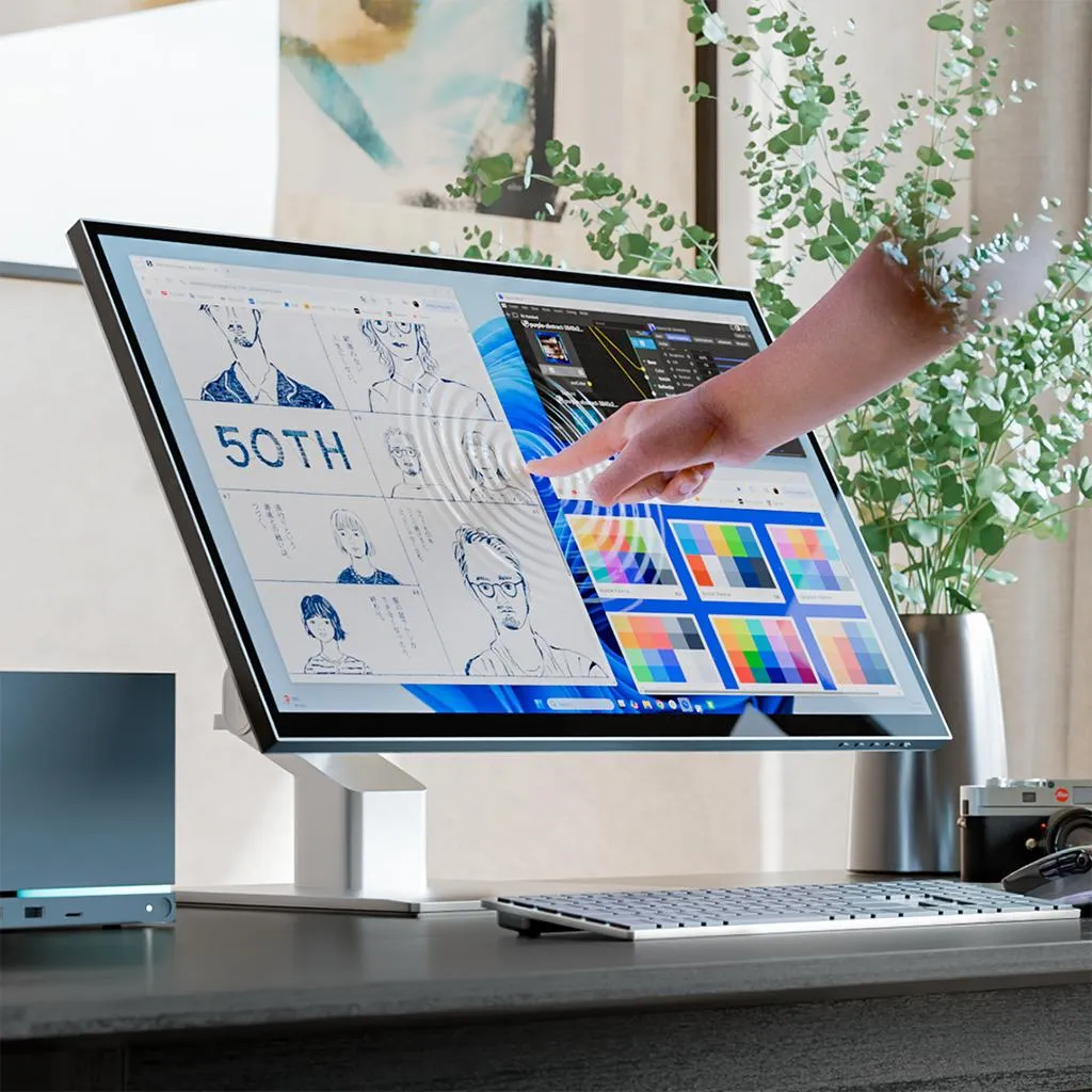 "6K 32-tums pekskärmsmonitor med 10-punkts multitouch och stöd för penna enligt Microsoft Pen Protocol 2.0. USB-C-hubben levererar video, data och laddning upp till 95 W, samt HDMI/DisplayPort och ett vikbart stativ för skissarbete eller upprätt användning."