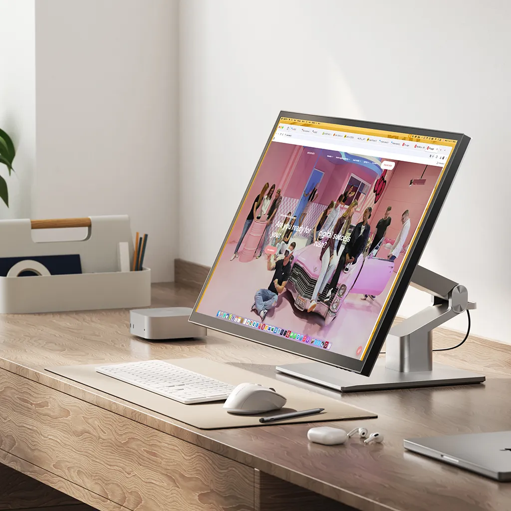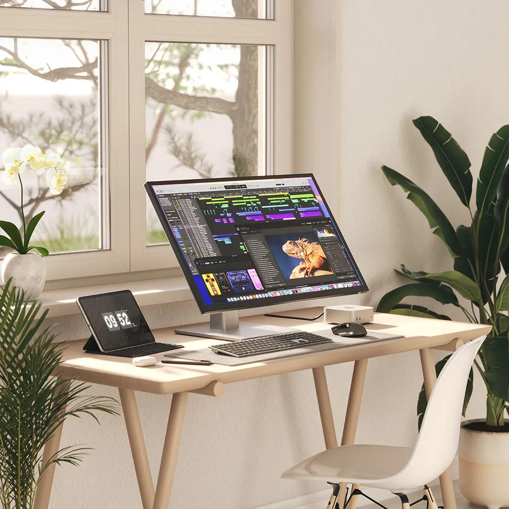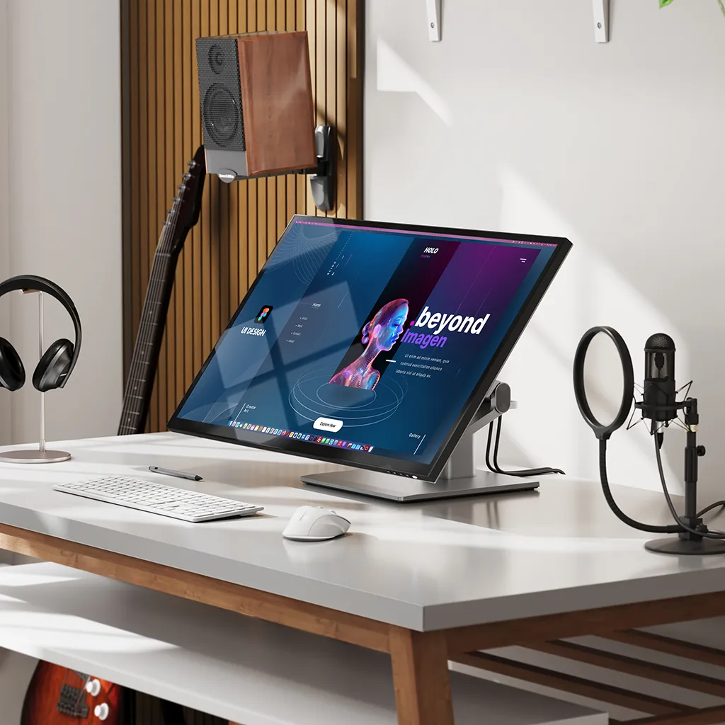 Det medföljande Clarity Fold Stand gör att du direkt kan växla mellan traditionell, upprätt skärmanvändning och ett lågt, ergonomiskt skissläge där skärmen vilar nära skrivbordet, som en ritplatta. Oavsett om du skriver, ritar eller redigerar kan du hitta den mest bekväma vinkeln för långa pass. Stativets 360‑graders roterande bas gör det enkelt att vrida skärmen och visa ditt arbete för kunder, kollegor eller samarbetspartner utan att flytta hela monitorn eller ändra din sittställning.